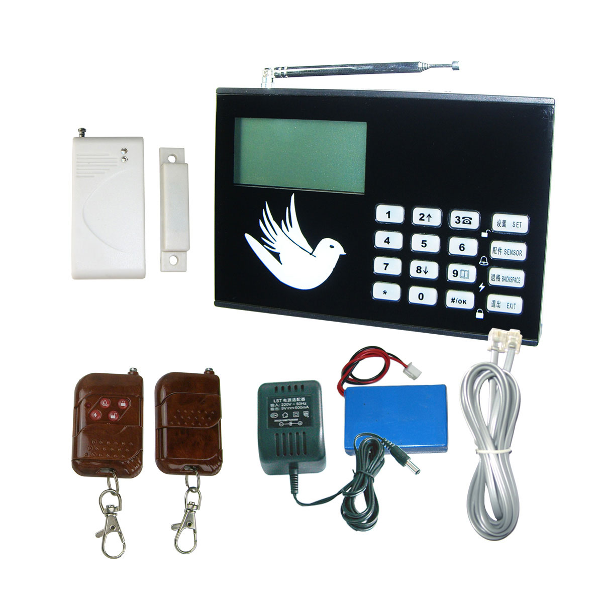 标准配置: 主机1台(不带录音)+门磁1付+遥控器2个+电话线1条+内置警号1个+内置锂电池+普通电源1个