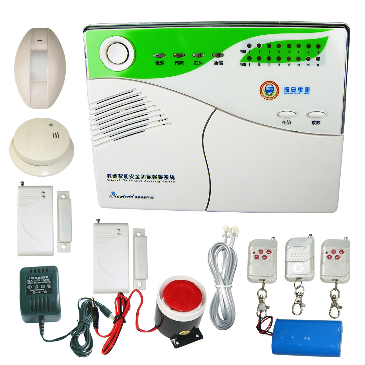 基本配置为:主机1台+(烟感或气感)1只+(智能双幕帘或加强红外)1只+遥控器3只+门磁2付+外接警号1只+普通电源1只(9V300mA)+内置7.2伏锂电池+电话线1条,豪华大盒包装,内膜植绒膜